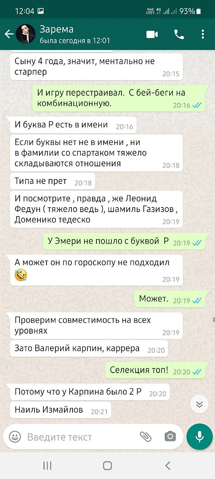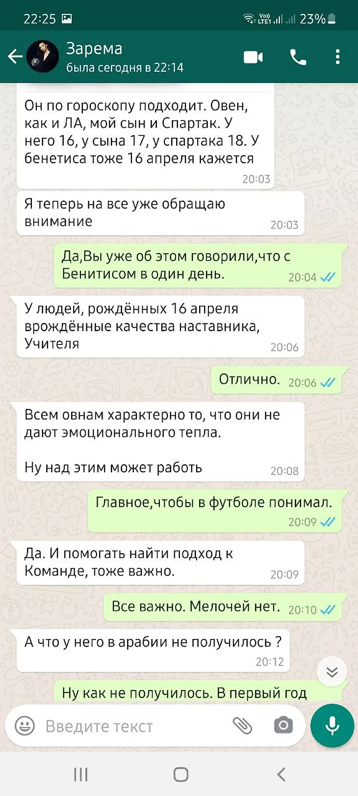 Первый скриншот: Зарема говорит о том, что Руй Витория хорошо подходит по гороскопу. Аргумент: Руй по знаку зодиака Овен – как Федун, один из сыновей Заремы, Рафаэль Бенитес и «Спартак» (имеется в виду дата основания клуба). Также Салихова отмечает врожденные качества наставника у людей, которые родились 16 апреля.