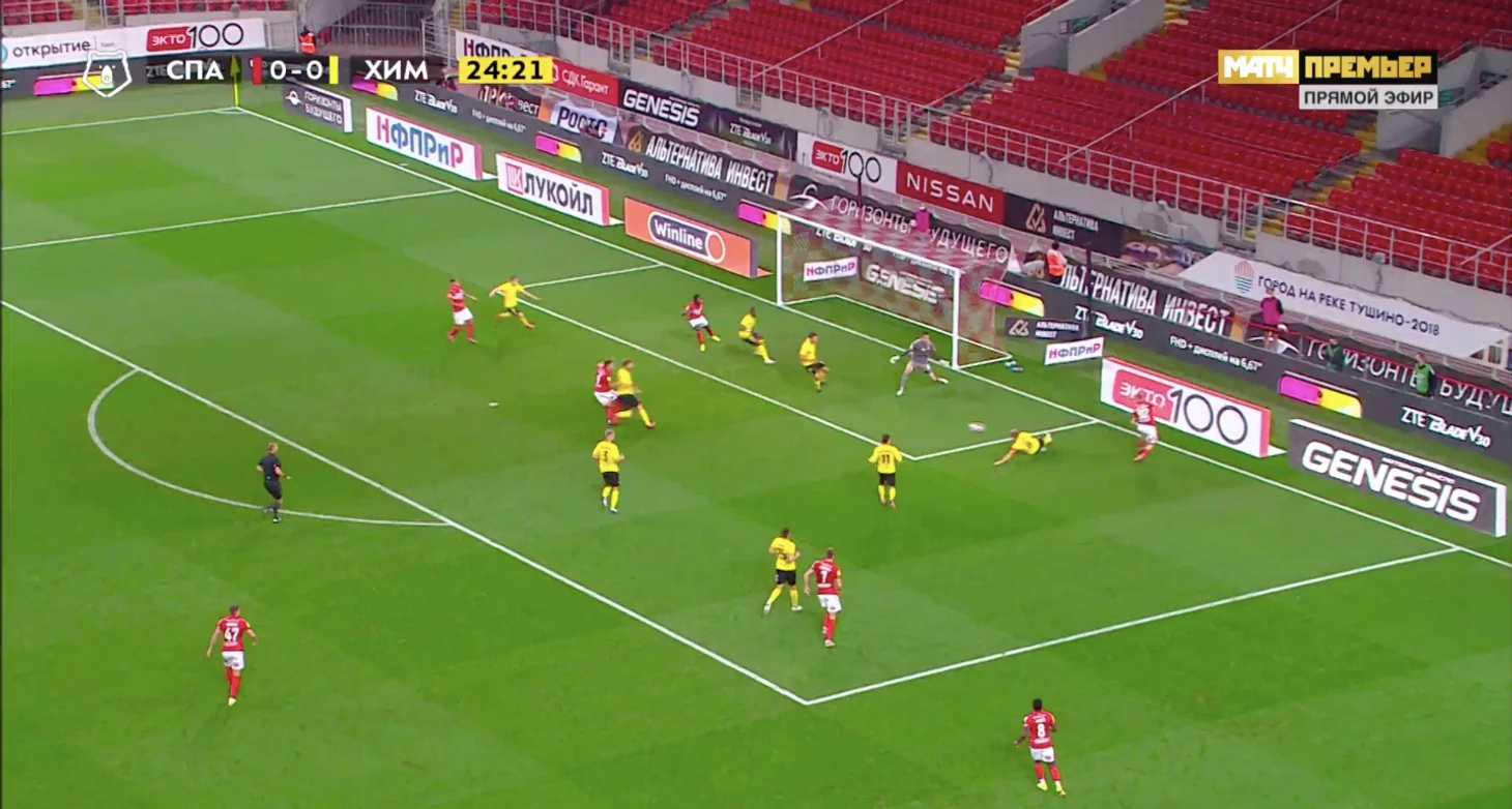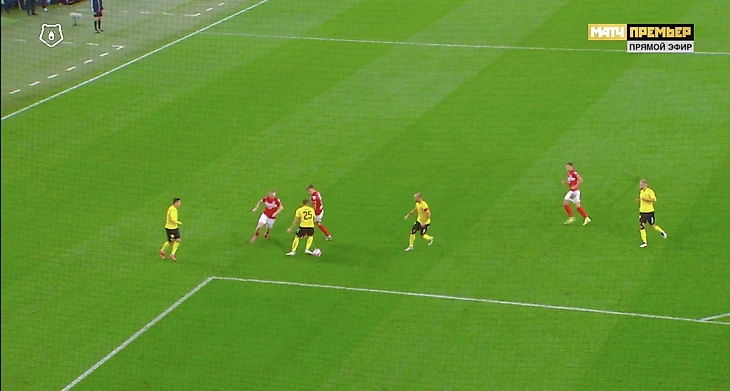 В 3-4-3, с которыми вышел «Спартак», Рассказов был правым центральным, тем удивительнее его появление в чужой штрафной. Он ворвался под шикарную передачу Соболева пяткой – только гляньте на его пас с этого ракурса. Трое соперников сразу же отрезаны, а партнер на ходу и с пространством.