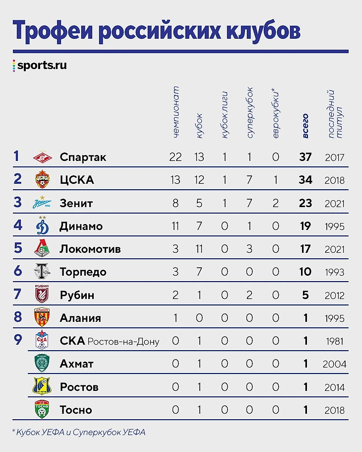 Споры о том, кто самый крутой – извечная тема для любого турнира в любом командном виде спорта. И никакие аргументы – даже самые весомые и доходчивые – их не прекратят. В том числе и наши сводные таблицы, в которых мы собрали все титулы российских футбольных клубов.