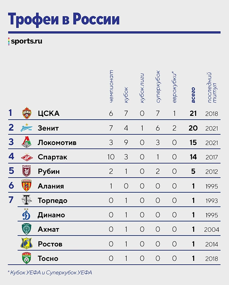 А в новой российской футбольной истории лидируют армейцы: во многом за счет ударных нулевых годов и первой половины десятых. Среди их наград есть и редкий Кубок УЕФА – но спустя три года после ЦСКА «Зенит» тоже взял эту чашку, а потом еще и урвал Суперкубок УЕФА – совсем уж раритет для нашего футбола.