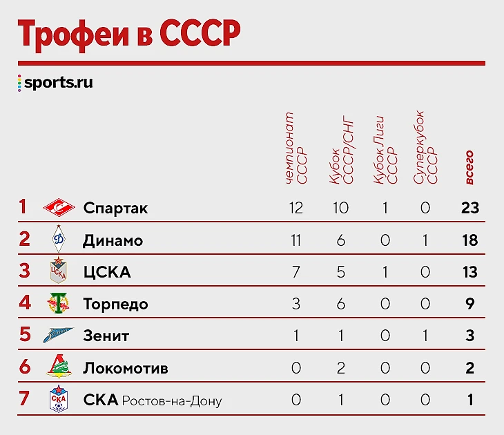 Что касается советской истории – то «Спартаку» тут точно нет равных: 23 титула – и эта тема уже закрыта навсегда. И именно за счет нее клуб держится лидером сводной таблицы.