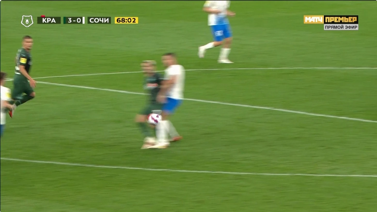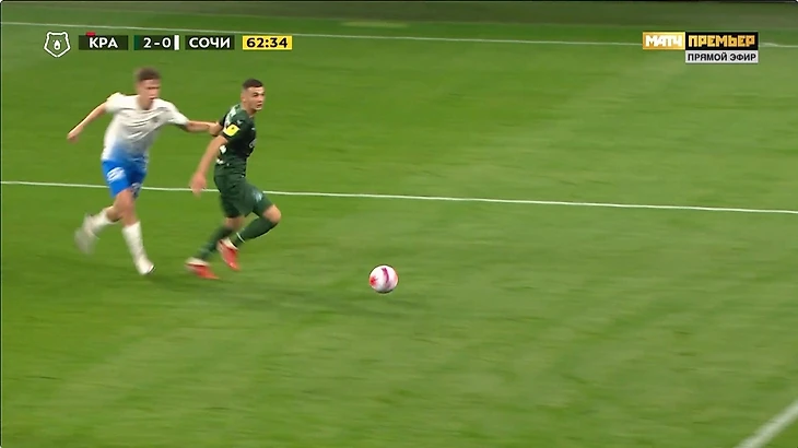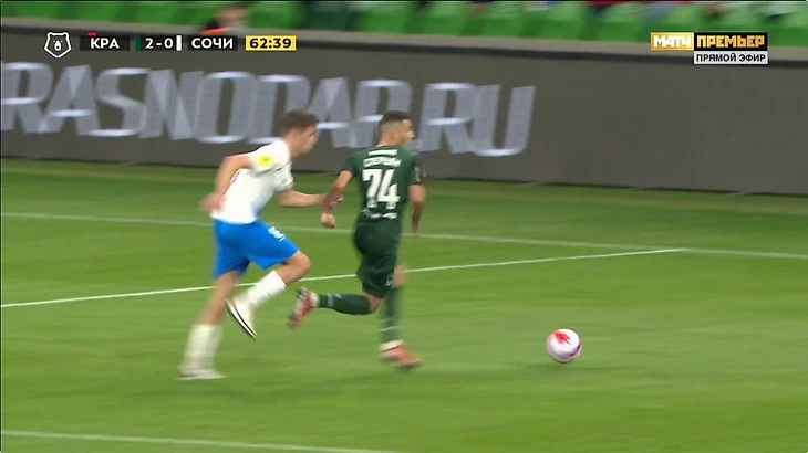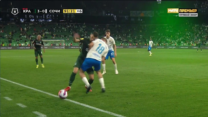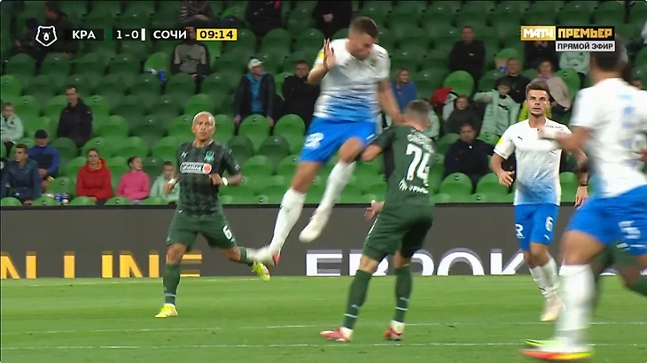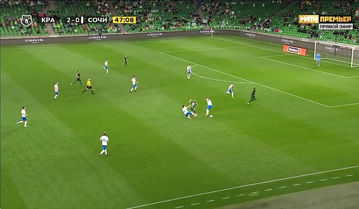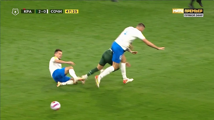 Спаиич подталкивает нападающего Сочи, который к слову да обыгрывал его но был не так близок к воротам, не в самом удобной позиции, и это фол последней надежды и красная. Сперцян выходит 1 на 1 и его останавливают рукой и я понимаю, что удалить нельзя... потому-что это будет двойное наказание. Но эта желтая. И желтую не дают. И так вся игра.