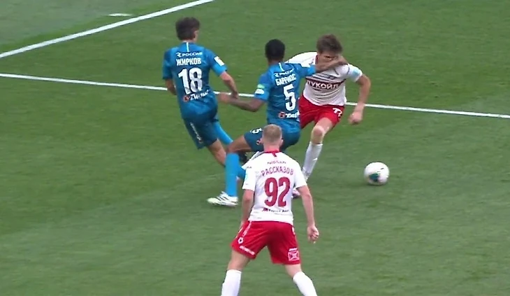 Здесь только "избранные скриншоты". Здесь нет сомнений в том, что с моменте с Жирковым и Соболевым, не было чего-то похожего на обоюдку. Здесь только финальная часть этого контакта, где Жирков, падая не по собственной инициативе, тянет дельфина за футболку, и будет это называться "Юрий Жирков утянул в своей штрафной за футболку" и никак иначе. Момент "Барриос-Соболев" будет упомянут без одной интересной и немаловажной детали - Соболев воткнулся в руку Барриоса при резком развороте, от чего у него резко и неестественно подкосились обе ноги, будто на лице у него находится нерв, от прикосновения к которому ноги моментально сгибаются. И что эта вот рисованность падения вероятно и повлияло на решение судьи.