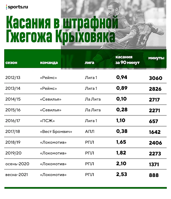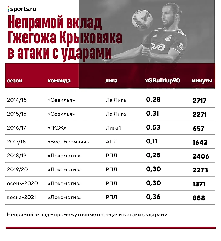 По непрямому вкладу в атаки с ударами (то есть Крыховяк не бил сам и не отдавал передачу под удар, а делал промежуточный пас) – второй результат в карьере. Но нужно учитывать, что в «ПСЖ» (там был лучший) поляк за сезон отыграл меньше, чем за весну РПЛ-2020/21, а также его роль и доминирование парижан на мяче.