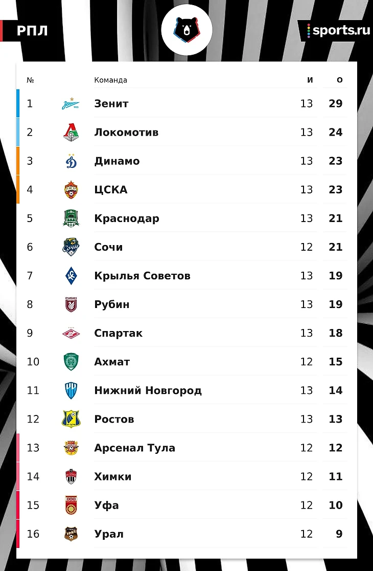 • Петербуржцы оторвались от «Динамо» и ЦСКА на шесть очков. После 7:1 над спартаковцами и 4:1 над динамовцами напрашивается параллель: в прошлом сезоне петербуржцы тоже подряд обыграли «Динамо» и «Спартак» (тогда по 3:1), оторвались на четыре очка, так и не упустив титул. Тогда был декабрь, но наращивание преимущества очевидно уже сейчас.