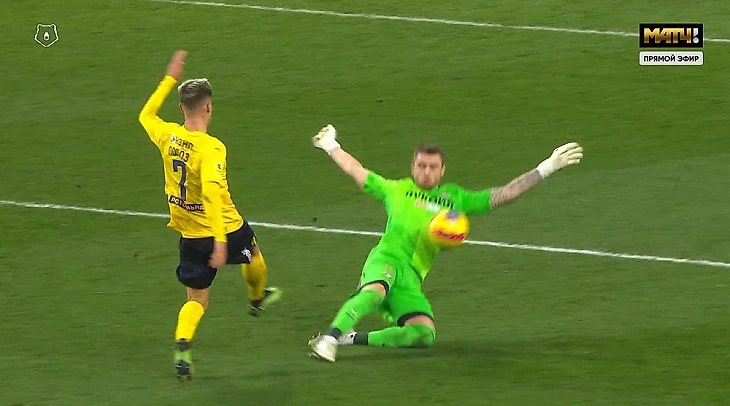 Во втором тайме дуэль Селихова и Полоза продолжилась. На 75-й минуте нападающий убежал один на один, но вратарь отлично вышел за пределы штрафной и спас команду.
