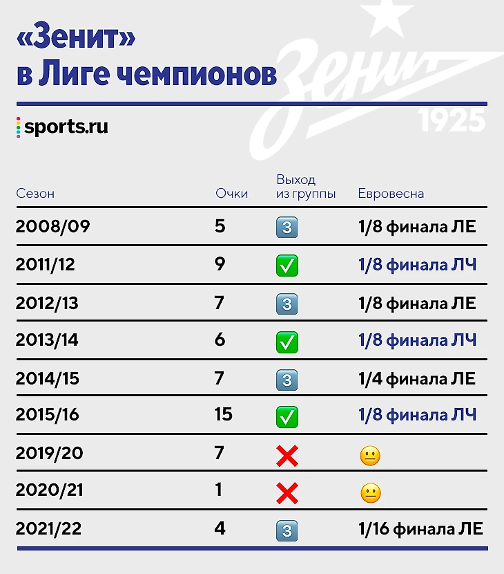 Взгляд пессимиста: из Лиги чемпионов «Зенит» вылетел третий сезон подряд, выходить в плей-офф не получается с 2015-го (того сказочного сезона с пятью победами в пяти матчах). За эти шесть лет России в плей-офф ЛЧ так и не было – «Зенит» остается последним участником.