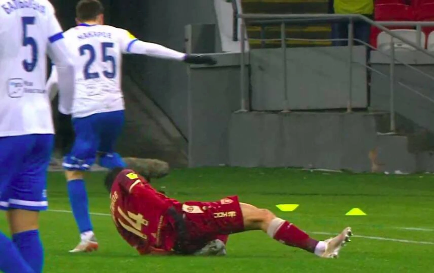 Под самый конец первого тайма страшную травму получил Михаил Костюков – он врезался в Вячеслава Грулева, а при падении его голеностоп жутко подвернулся.