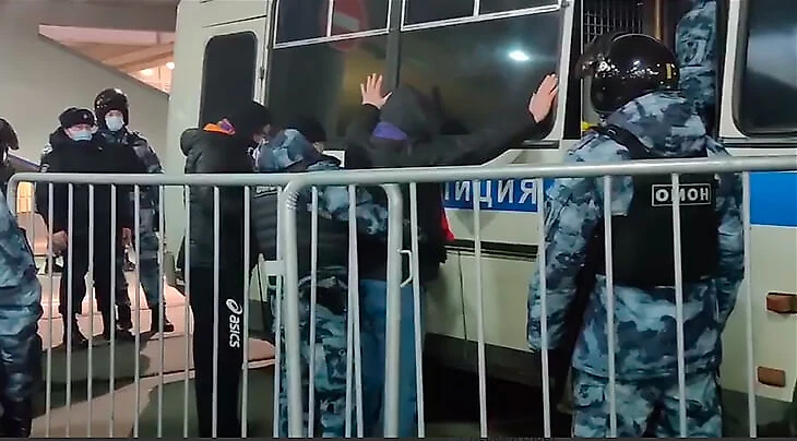 • Болельщиков ЦСКА c трибуны С выпускают небольшими группами, они проходят через коридор из сотрудников ОМОНа, у автозаков каждого обыскивают, затем отправляют внутрь. Одни машины с болельщиками отъезжают, на их место прибывают другие.