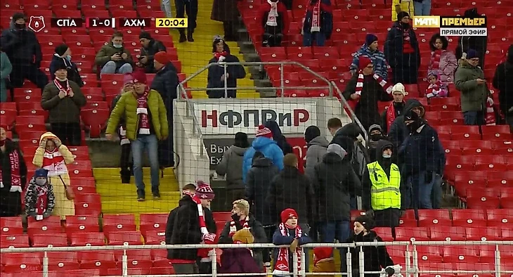 Михаил Поленов: Ну а вот и болельщики, которые уже потянулись к выходу. Это акция, о которой уже довольно много сказано. К сожалению, у нас такой традицией становится в последних турах перед большой паузой очередная серия конфликта болельщиков и правоохранительных органов. Будем надеяться, что она решится. Конечно, болельщики и фанаты – часть игры, без них никуда.
