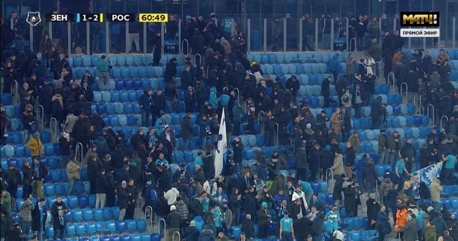 Константин Генич: Ну, уходят болельщики. Не согласны с тем, что произошло после матча ЦСКА – «Зенит» на «ВЭБ Арене». Я уже говорил в первом тайме, что все заинтересованные стороны в этом даже не конфликте, а в недопонимании обязательно сядут за стол переговоров, все это обсудят в спокойной обстановке. Но сейчас акция, которую затеяли болельщики ЦСКА, поддерживаемая остальными. Выложились болельщики «Зенита» очень прилично до 60-й минуты и, как и сказали, свой сектор покидают.