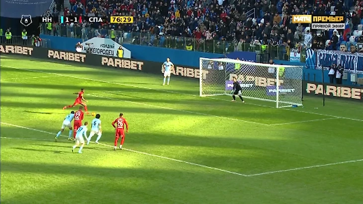 Промес пробил коряво – слабо и по центру, но Артур Нигматуллин прыгнул в угол, и мяч закатился в ворота. Казалось, гол.