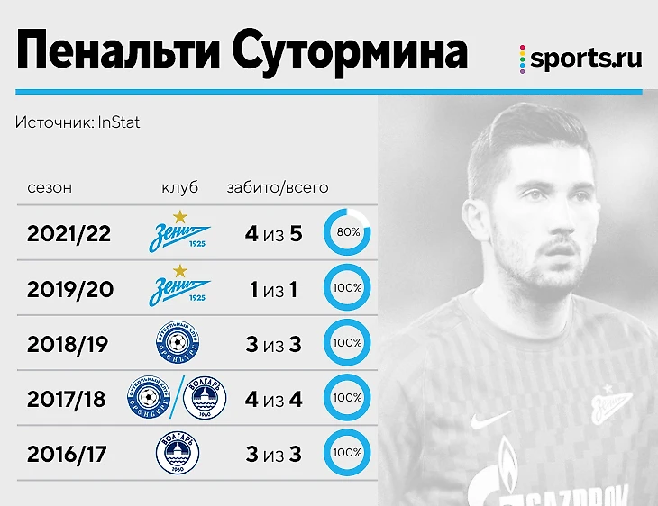 • В «Зените» не сразу доверили пенальти. Зато в этом сезоне Сутормин стал штатным пенальтистом команды Семака. Всего за «Зенит» Алексей четыре раза подходил к точке – и все разы был точен.