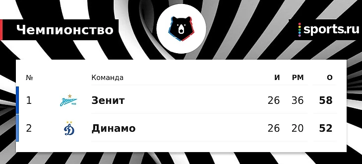 • «Зенит» оторвался от «Динамо» на 6 очков: 58 у петербуржцев, 52 – у команды Сандро Шварца.