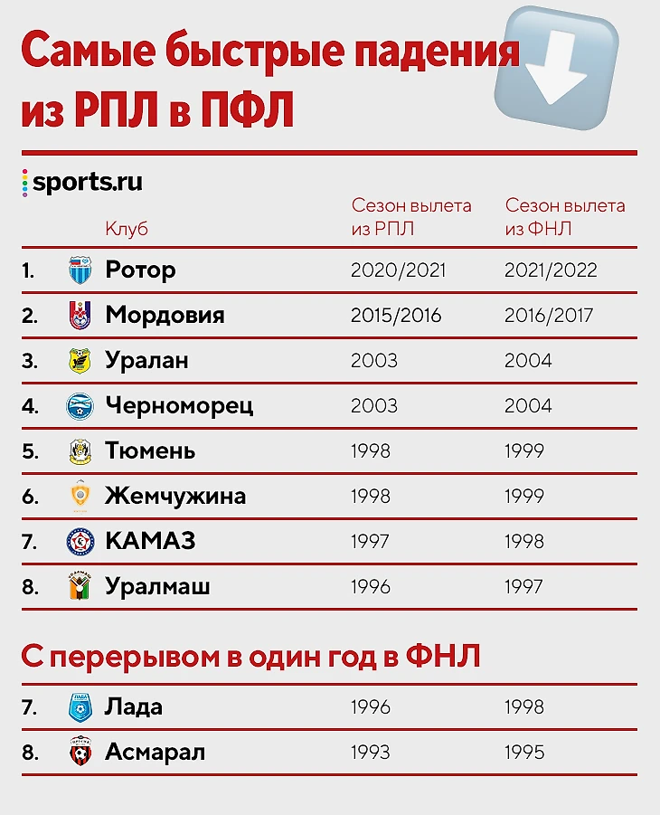 • Наиболее свежий пример – «Мордовия»-2015/2017. Причем вылетели после самого успешного года за несколько лет: в сезоне-14/15 под руководством Юрия Семина забрались аж на 8-е место.