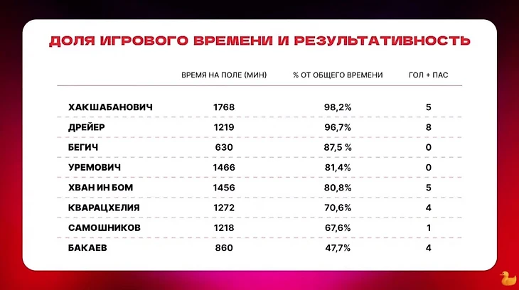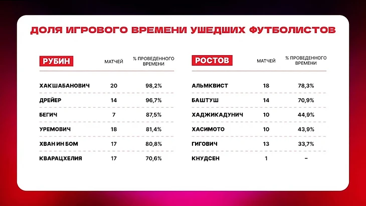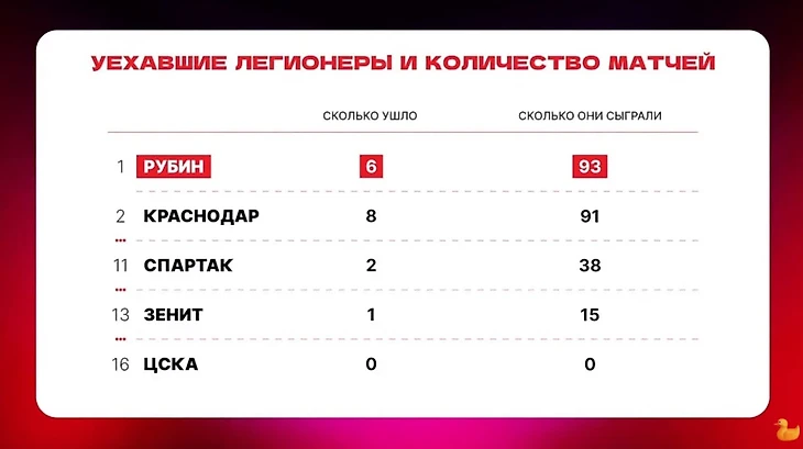 «И здесь мы в лидерах. Ушедшие футболисты провели 93 матча – больше, чем у любого другого клуба. Мы зависели от легионеров больше всех – тут это тоже хорошо видно».