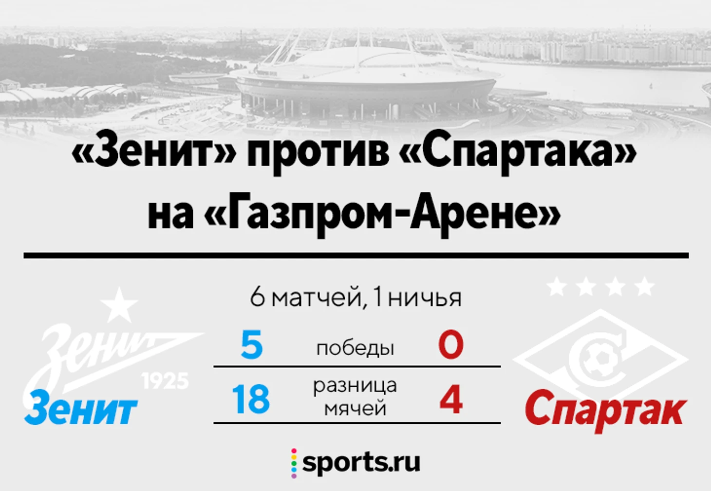 Санкт-Петербург – трудное место для «Спартака» (выиграли 1 раз за 10 лет). На «Газпром-Арене» у «Зенита» 5:0 по победам