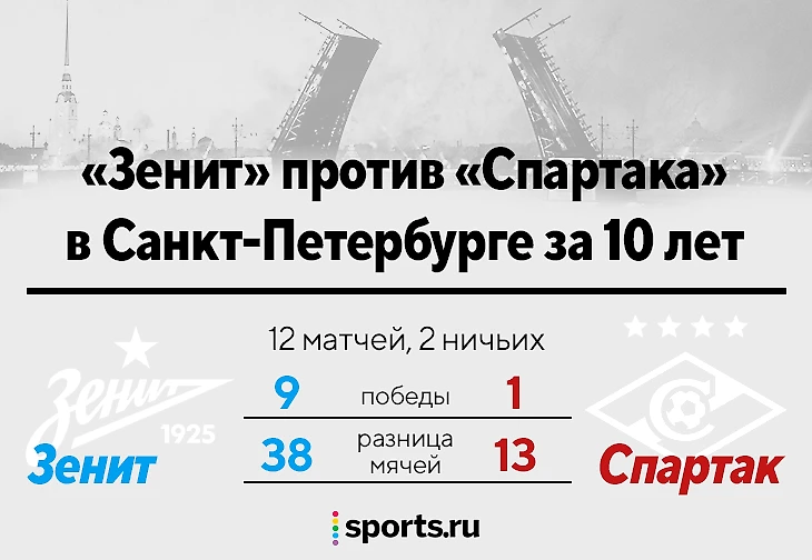 «Зенит» уверенно лидирует по всем показателям. С 2012-го «Спартак» лишь однажды увез победу из Санкт-Петербурга – в мае 2012-го (счет – 3:2). Тогда за «Спартак» забивали Динияр Билялетдинов, Эмануэль Эменике и Рафаэл Кариока, а за «Зенит» – Александр Кержаков и нынешний главный тренер команды Сергей Семак.
