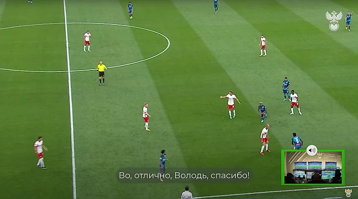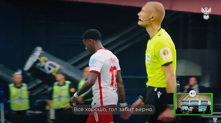 Тут сразу поясним: главный арбитр слышит не все, что обсуждают между собой ВАР-судьи. То, что приходит ему в ухо, в ролике отдельно обозначено зеленой рамкой и динамиком в углу экрана (как на скриншоте), остальное – переговоры видеоассистентов между собой, которыми они не отвлекают главного.