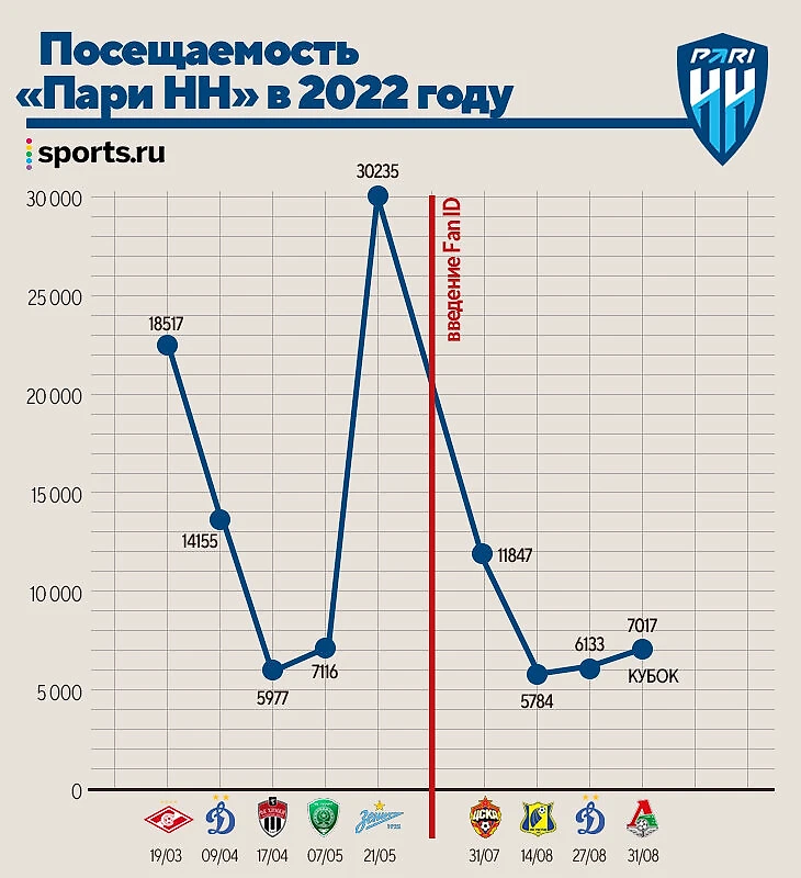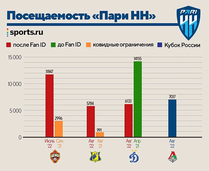 • Кубковая игра с «Локо» привлекла в будний день 7 тысяч. Это больше, чем два из трех матчей чемпионата с Fan ID (игры против «Динамо» и «Ростова» собрали по 5-6 тысяч). А ведь на то же «Динамо» еще в апреле приходило больше 14 тысяч нижегородцев (разница в 2,3 раза).