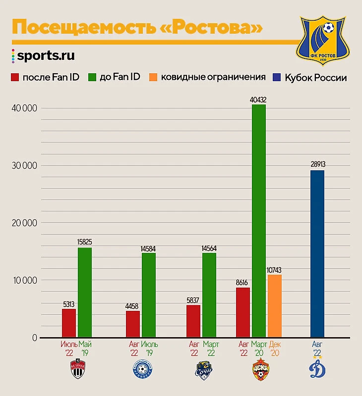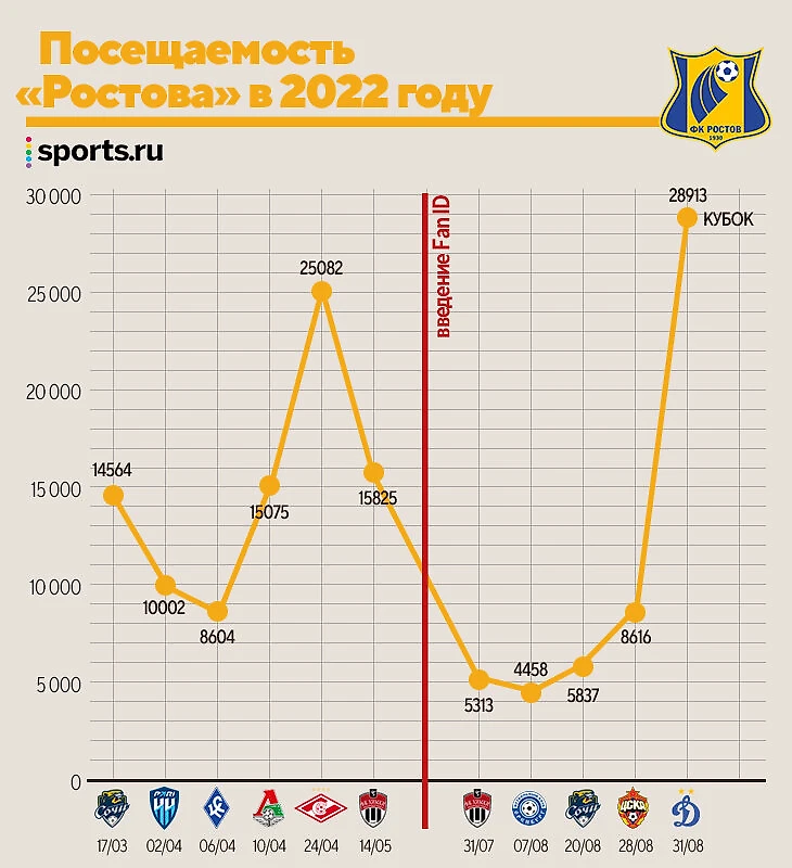• Игра с «Динамо» – рекордная для «Ростова» по посещаемости в этом году. Обратите внимание как просела посещаемость команды после введения Fan ID. Теперь средние для прошлого сезона 15 тысяч где-то очень далеко.