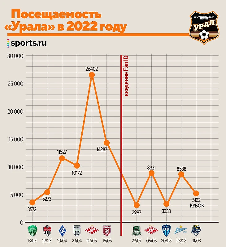 • В первых трех турах клуб собирал в районе 5 тысяч зрителей. До введения Fan ID на тех же соперников («Химки», «Оренбург» и «Сочи») ходило в три раза больше.