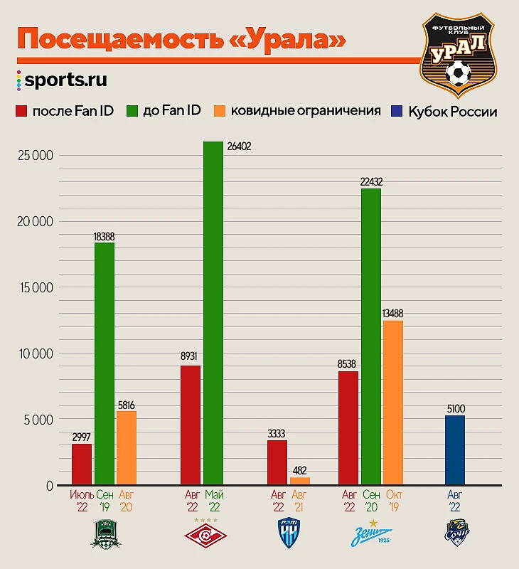 • На «Спартак» и «Зенит» в этом сезоне екатеринбуржцы ходят охотнее остальных соперников – в обоих случаях по 8-9 тысяч. Но это не идет ни в какое сравнение с показателями до Fan ID: «Спартак» еще в мае собирал в Екатеринбурге 26 400 зрителей (разница – 2,95 раза), а «Зенит» до пандемии – 22 400 (2,6 раза разница). В период коронавирусных ограничений на «Зенит» приходило почти 13 500, что в 1,6 раз больше, чем сейчас.