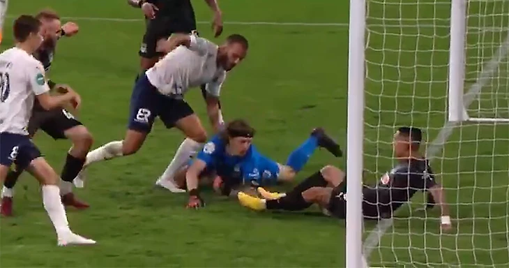 Эквадорец буквально сел на линию и на секунду зафиксировал мяч между ног.