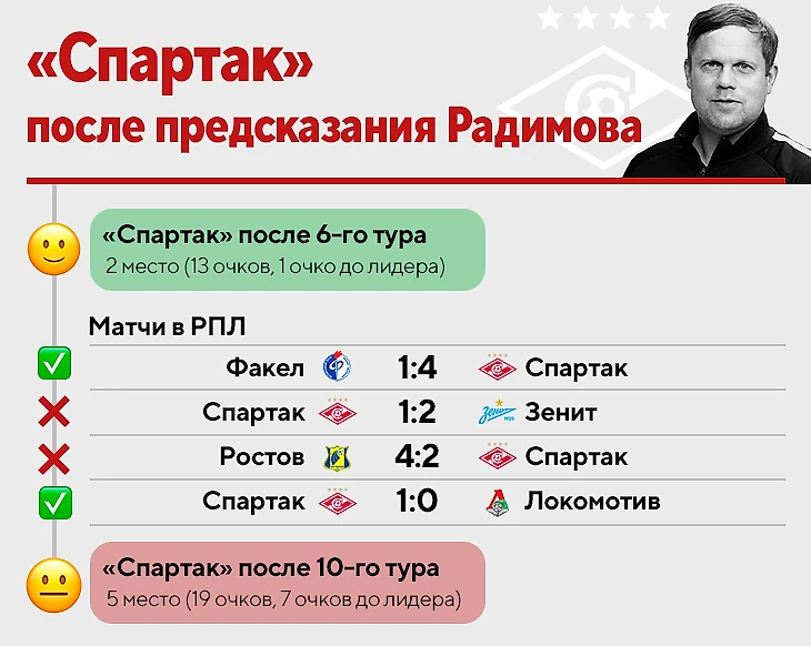 Видно, что «Спартак» превзошел ожидания Радимова – но потерял свой лидерский темп из первых пяти туров. 13 очков за первые пять матчей и только шесть очков – в следующих пяти. Разница есть.