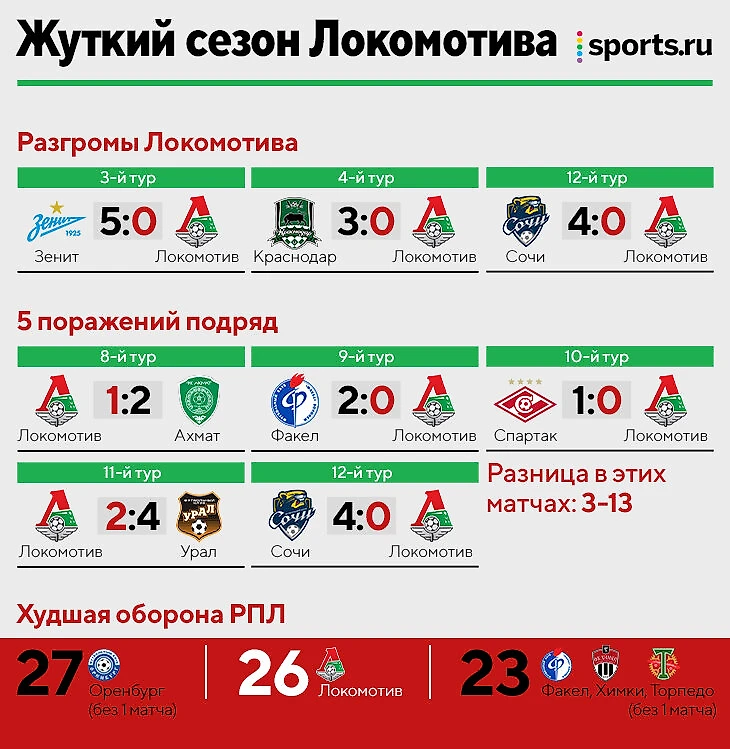 Такого провала в РПЛ у «Локомотива» еще не было. В сезоне-2016/17 после 12 туров было 11-е место и 12 очков, но пропустили тогда только 10 мячей – с нынешним (26 пропущенных) не сравнить.