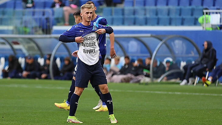 После забитого мяча Пиняев принял поздравления от партнеров, а затем приподнял игровую майку и показал заготовку – текст в поддержку недавно осужденного Николая Ларина.