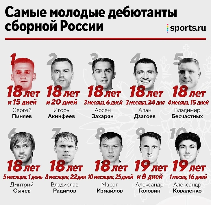 • Валерий Карпин постепенно омолаживает состав сборной России. В топ-10 самых молодых дебютантов уже три игрока начали при Карпине: Захарян, Коваленко и теперь Пиняев. Забавно, что на 11-м месте еще один дебютант при Карпине – Константин Тюкавин.