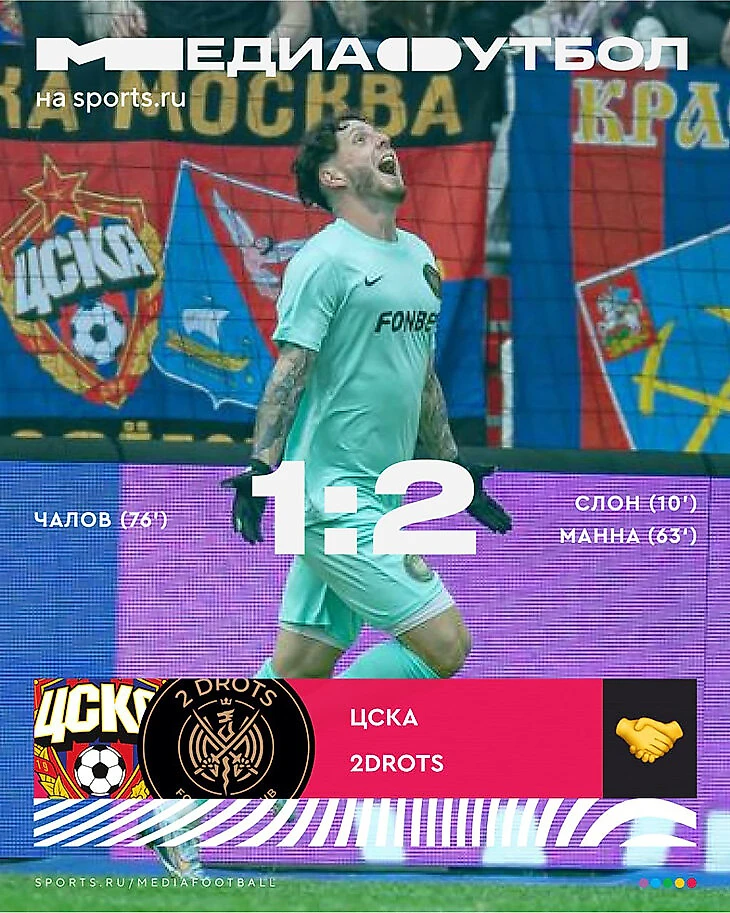 Игра неожиданно началась с гола Слона из 2Drots на 10-й минуте. Момент ЦСКА не оживил – команда во втором тайме пропустила еще, а ответила лишь одним голом Федора Чалова.