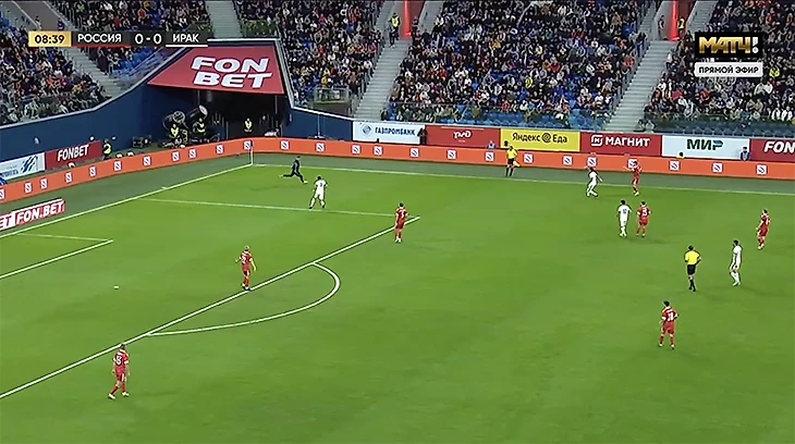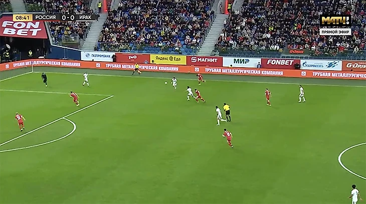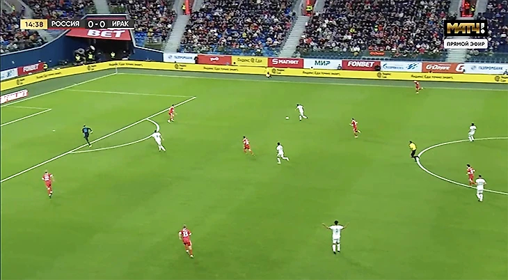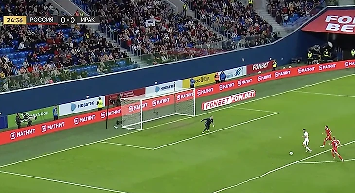 После двух голов сборная России не расслабилась и продолжила давить. На 65-й вратарь Ирака Джалал Хассан выдал двойной сэйв после ударов Миранчука и Осипенко, а три минуты спустя Соболев попал в перекладину.