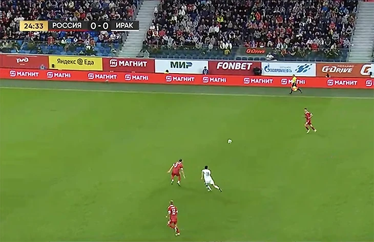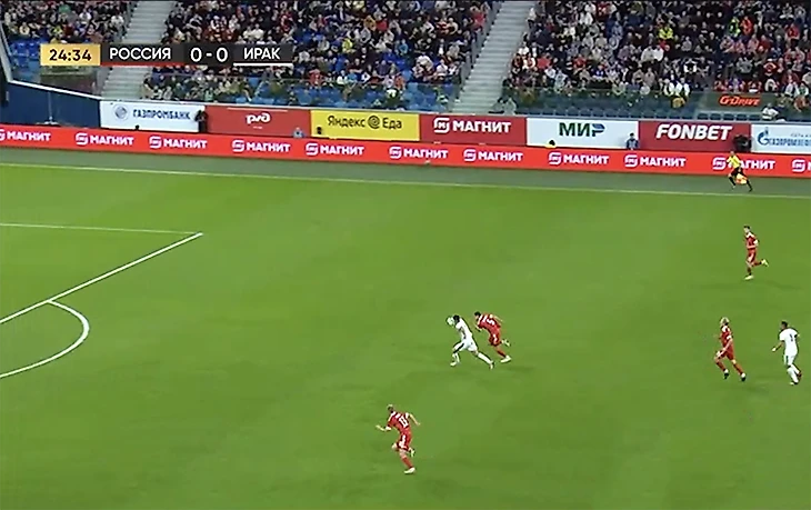 В середине тайма Ирак снова создал проблемы сборной России благодаря ошибке защитника Максима Осипенко: Айман Хуссейн выскочил 1-на-1 с Песьяковым и пробил мимо.