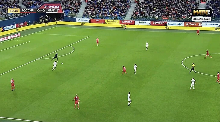 • В первом тайме сборная Ирака какое-то время била по воротам больше, чем сборная России. Закончили 10-9 по ударам в пользу России, по ударам в створ 2-2. Хотя по владению Россия доминировала: 66% на 34%.