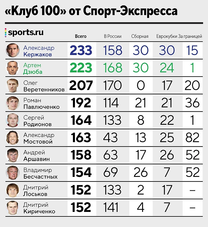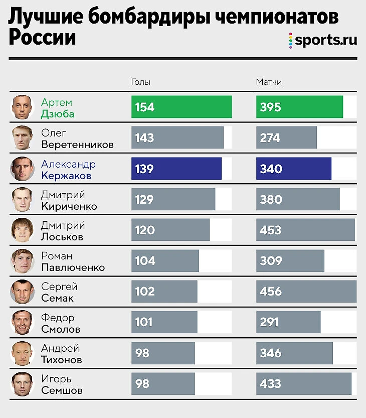 Главная особенность: учитываются не только голы в чемпионатах страны, но и мячи во всех других официальных матчах – то есть в Кубке, за сборную, в еврокубках и иностранных клубах. Артем тут четвертый. До лидирующего Олега Блохина пропасть, а Кержаков впереди всего на три мяча.