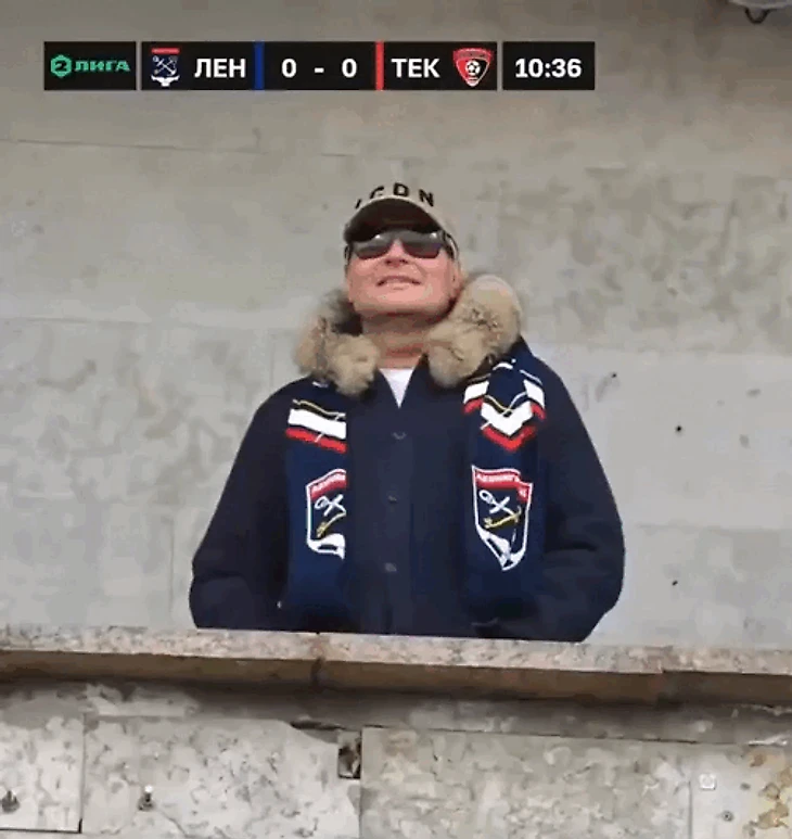Кадр с субботнего матча Второй лиги, к которому жизнь нас не готовила: Николай Басков на трибуне стадиона «Петровский», в шарфе футбольного клуба «Ленинградец».