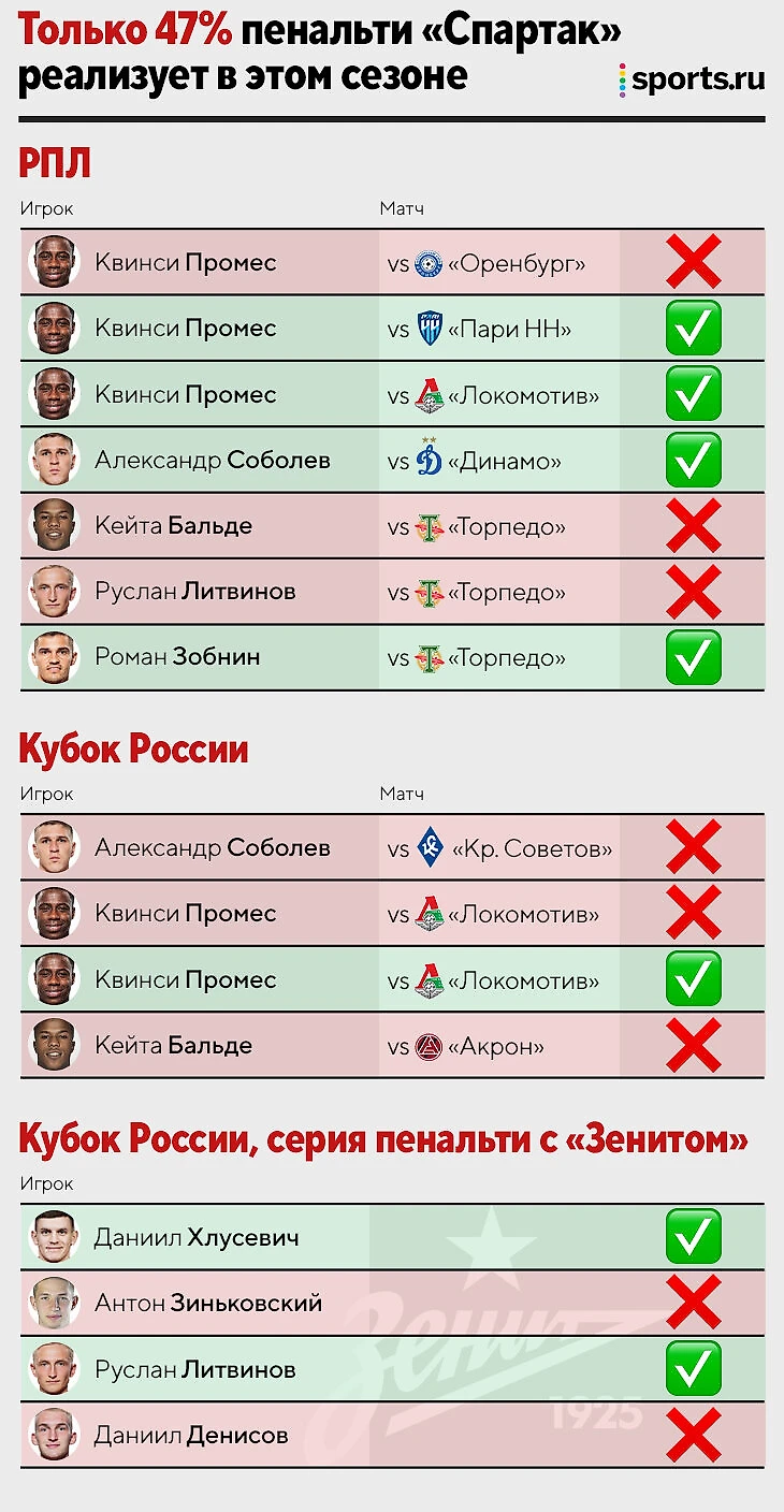 Если вспомнить мучения Квинси Промеса на исходе игры против «Локо» в Кубке и прошлогоднюю серию пенальти против «Зенита», становится совсем грустно. В этом сезоне «Спартак» вообще забил меньше половины своих пенальти: да, даже если не брать в расчет послематчевые серии, «Спартак» забил пять пенальти, а не реализовал шесть. Ужасно.