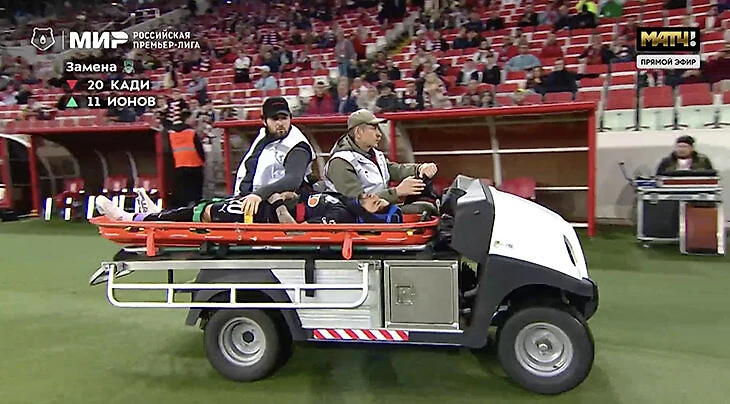 Игрока «Краснодара» медленно и очень осторожно положили на носилки электрокара, зафиксировав голову ремнями.