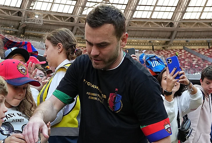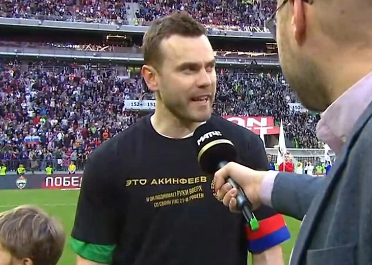 Каждый игрок ЦСКА после матча переоделся в особенную футболку – с фамилией на груди и персонифицированной фразой, шуткой. У Акинфеева было: «И он поднимет Руки Вверх со своим уже 21-м трофеем». Очевидно, что отсыл к тому, как вратарь любит песни Сергея Жукова.