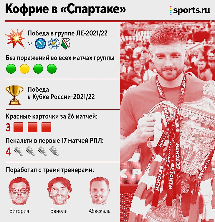 • В «Спартаке» у Кофрие 26 матчей во всех турнирах – и сразу три удаления, которые уместились в 11 последних игр 2021-го. Первое затмила легендарная победа в Неаполе, второе запомнилось тем, что «Спартак» в итоге получил от «Зенита» семь. Третье – против «Сочи», когда проиграли 0:3. Капитан Георгий Джикия реагировал: «Это очень плохо. Мы, безусловно, общаемся, объясняем ему, что у нас немного другой чемпионат, чем тот, где он был».