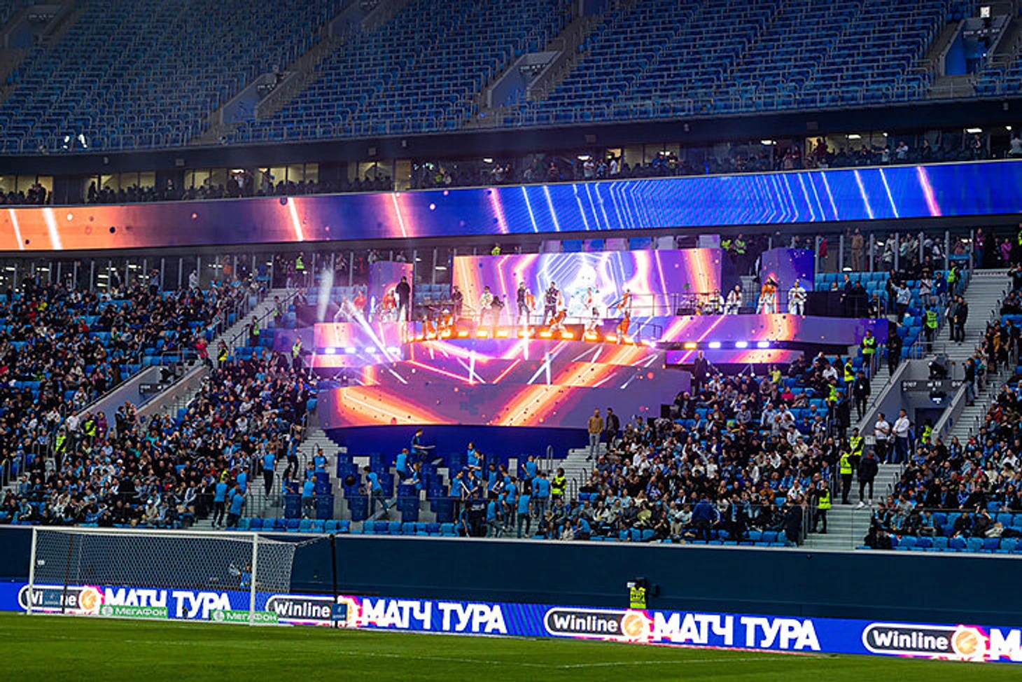 «Зенит» поделился деталями: сцена повторяет очертания Стрелки Васильевского острова, технически выполнена так, чтобы проводить достойные концерты и без проблем принимать большие музыкальные банды, артистов с танцевальными номерами – выступления любой сложности.