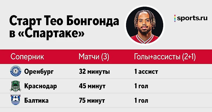 Так Бонгонда стал первым игроком «Спартака» в 21-м веке, оформившим голевое действие в каждом из первых трех матчей за клуб. При этом только с «Балтикой» экс-игрок «Кадиса» вышел с первых минут – до этого были замены во втором тайме.