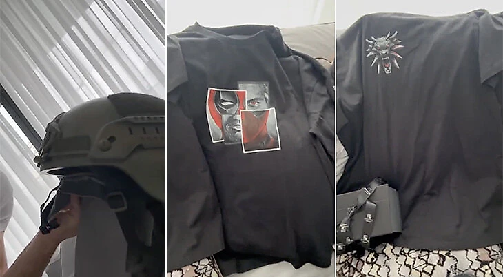 Слева – внезапно военная каска, а рядом образ Дэдпула и футболка с лого из «Ведьмака».