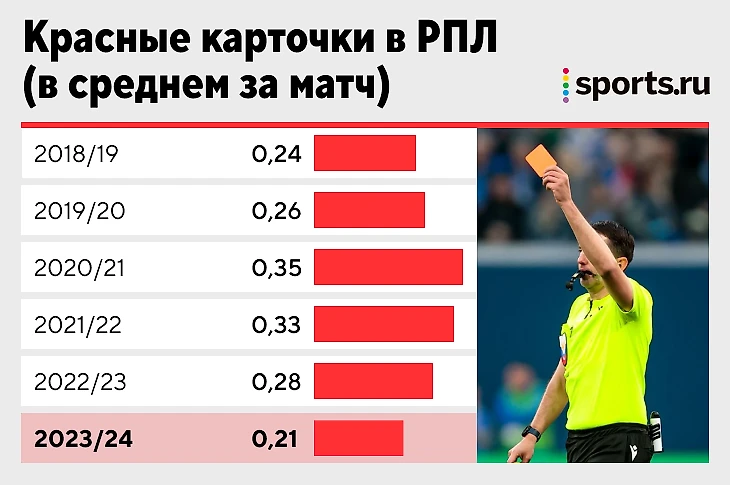 Рекордный показатель – в сезоне-2020/21, тогда давали в среднем красную каждые три матча.