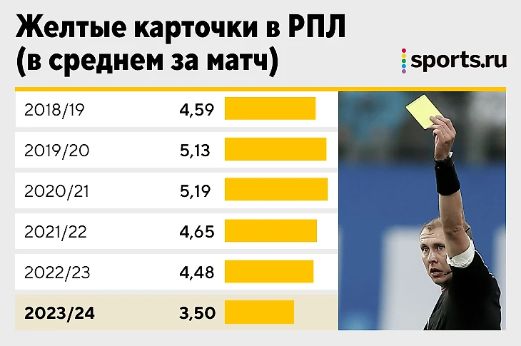 За последние пять сезонов арбитры в среднем показывали не меньше четырех карточек, дважды заходило за пять предупреждений. В сезоне-2023/24 судьи реже пользуются желтыми.