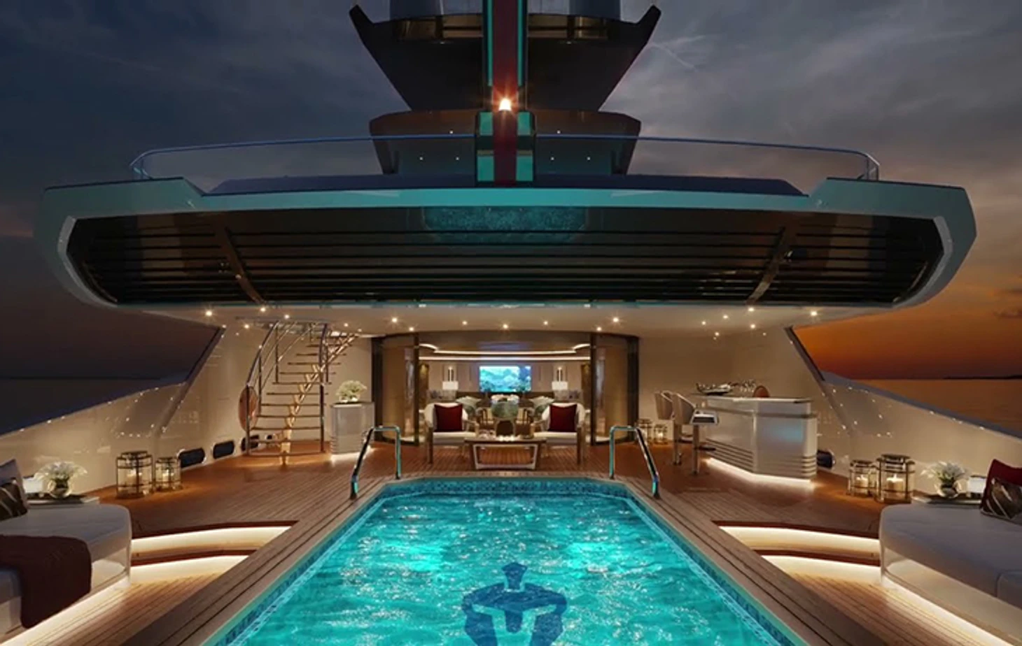 На судне много интересного: пейзажный бассейн размером 6,5 метра «с эффектом бесконечности», а также ступенчатая палуба, винтовая лестница и стеклянный лифт, соединяющий все палубы.