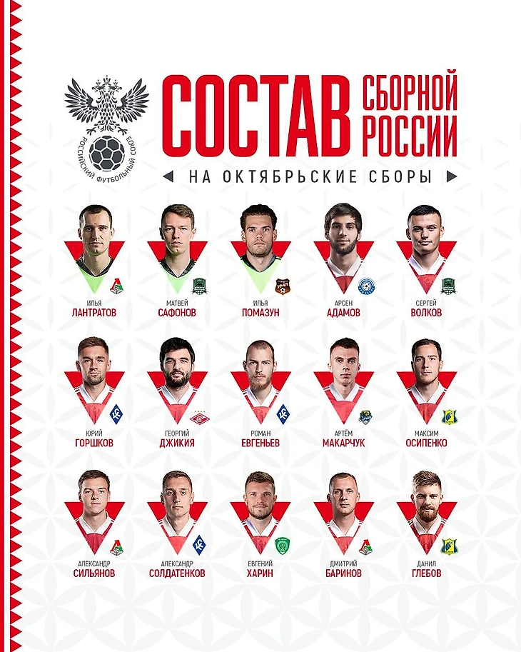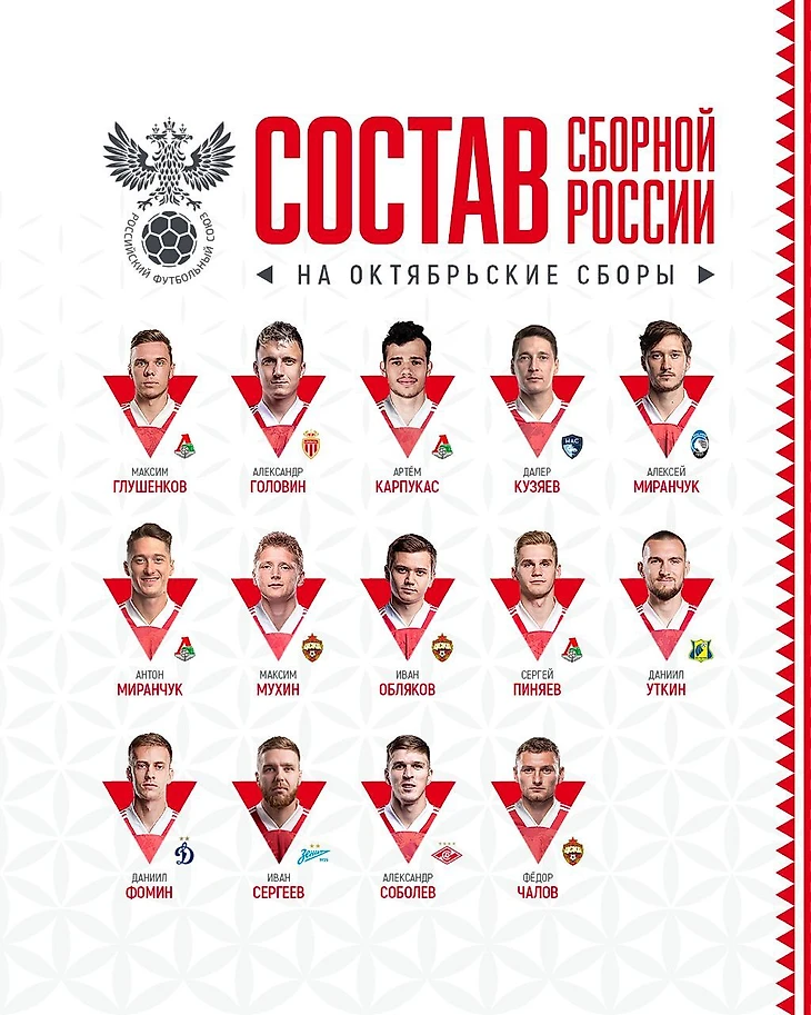 ● Лидер по вызванным игрокам – «Локомотив» (7). По три вызвано из ЦСКА (Мухин, Обляков, Чалов) и «Крыльев» (Горшков, Евгеньев, Солдатенков). Из «Спартака» – Джикия и Соболев, от «Зенита» едет только Иван Сергеев.