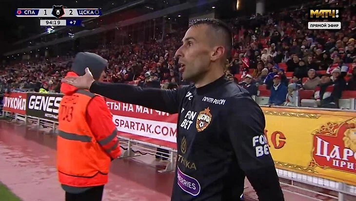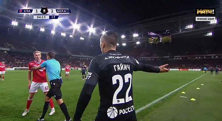 95-я минута: прошло полминуты, но ЦСКА не ввел мяч в игру. Дальше крупные планы Гильермо Абаскаля и Константина Кучаева. Потом появляется Гайич с вопросом к судье на русском языке: «Ты видел, что он сделал?» И показал руками, что его толкнули.